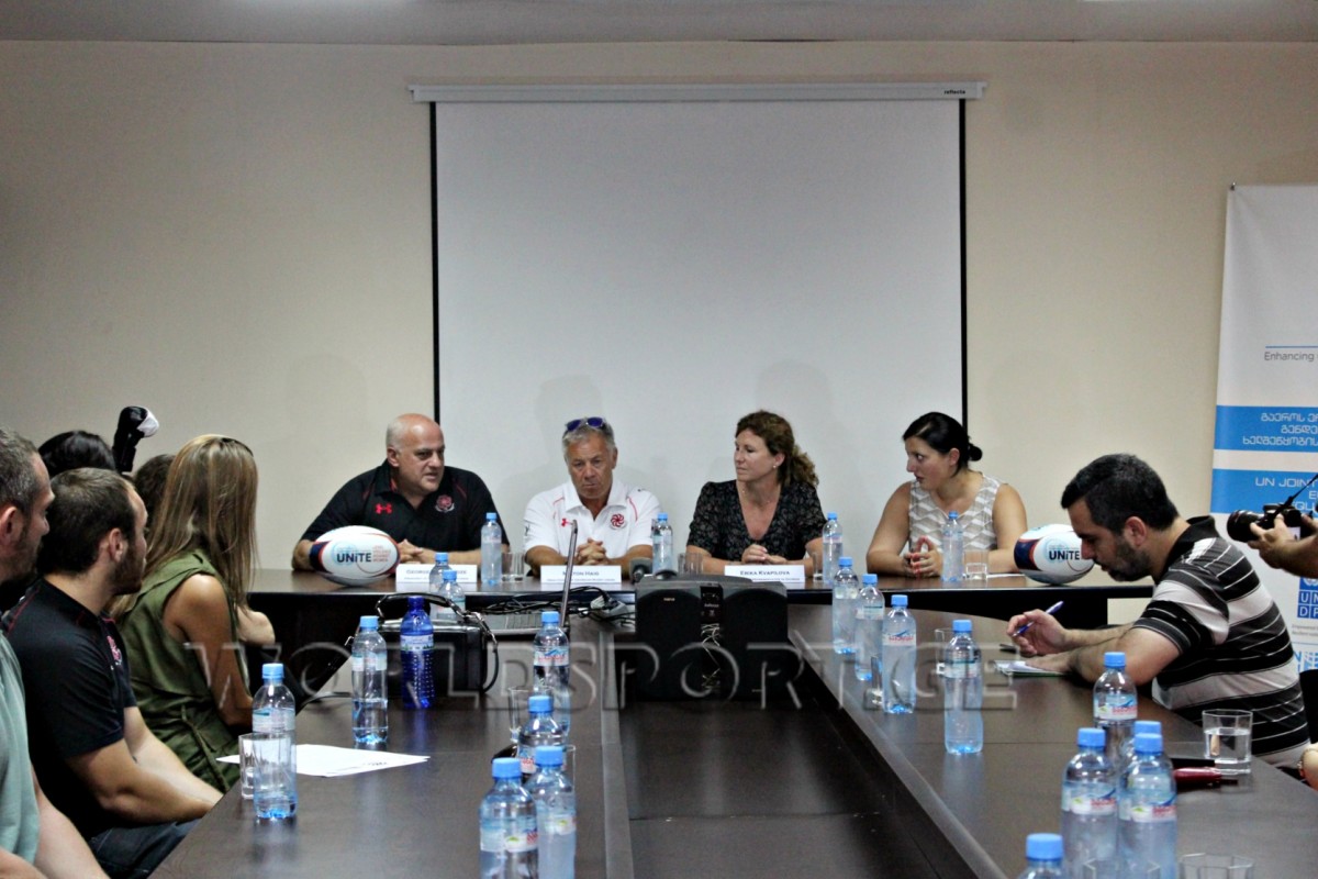 Giorgi Nizharadze, president of Rugby Union, National team’s head coach Milton Haig, “Lelos” Lasha Khmaladze and Vazha Khutsishvili and Erika Kvapilova, the representative of UN Women Organization in Georgia attended the special press conference.