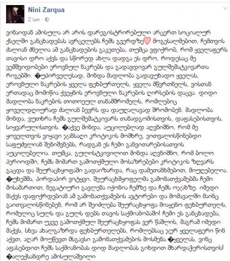 “It is very difficult for me to make this statement but I think everything has its time and now time has come for me to say goodbye to the national team and to become an ordinal fan. First of all, I want to thank everybody, all players of the national team, all coaches who I have worked with. I want to thank every employee of the national team who work hard every day. Also, I would like to thank my fans for their support, appreciation and love. I want to note that I always supported constructive criticism because it is important for my development. However, I have to note that the recent criticism and insults towards me are beyond limit. It had a negative influence on my family and me. I hope the authors of these criticisms will think about it and in the future they will not insult the football player who does his best! I want to thank everybody who appreciated my work!” – Aleksandre Amisulashvili said in his statement.