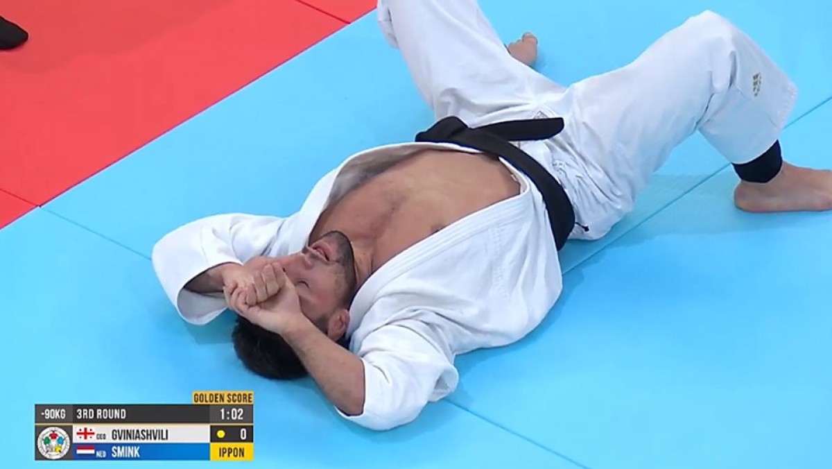 Gviniashvili easily beat Ajay Devilal Mistry of India but then unexpectedly lost to Jesper Smink of Netherlands by ippon.