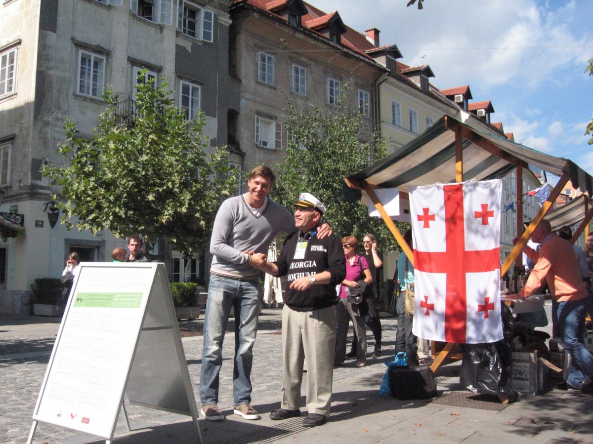 Yesterday Georgian wine expo started at the bank of river Ljubljanica in Ljubljana. Vladimer Boisa informed us with this interesting event. I accidentally met him at the river bank with his wife. I heard a shout in Ljubljana: “Georgia, Sokhumi, Tengo!” I looked behind and saw Vova Boisa who I met at Georgia-Spain game in Celje on 9 September. Vova told me he was in a hurry to attend the games of EuroBasket but he took me to that river bank where Georgian wine expo was taking place. It took 5 minutes to get to the place where Aleksandre Chkuaseli, acting ambassador of Georgia in Slovenia, greeted us. He told us that by the initiative of the mayor of Ljubljana, wine expo of EuroBasket participant countries has started in the city. On 14 September this event started by a two-day expo of Georgian and Spanish wine. Other participant countries of EuroBasket will join the expo in the next days. Our wine expo is held with the support of Georgian Embassy. One of the Slovenian companies purchased Georgian wine and presented it on today’s expo. Wine testing is free and purchase – is not. A lot of Slovenians and tourists visited our stalls for half an hour and some of them even bought it.