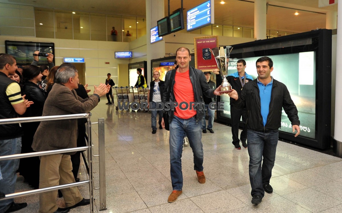 Georgian national judo team, triumphant of European Championship, returned in Tbilisi this morning. About a hundred supporters gathered at the airport. Besides family members, current and veteran athletes and coaches officials of Judo Federation and Ministry of Sport and Youth Affairs also were at the airport.