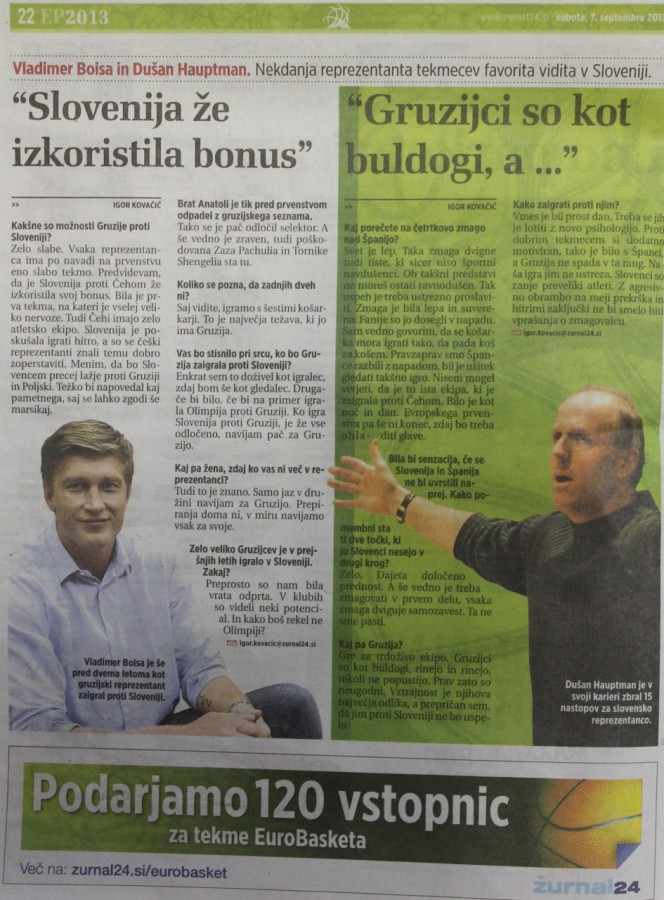 By the way, the Slovenians highlighted fighting ability of the Georgians. The article of Jurnal proves it. Next to the interview of Vladimer Boisa, there is the comment of veteran Slovenian basketball player Dusan Hauptman who held 15 games in the national team. He says: