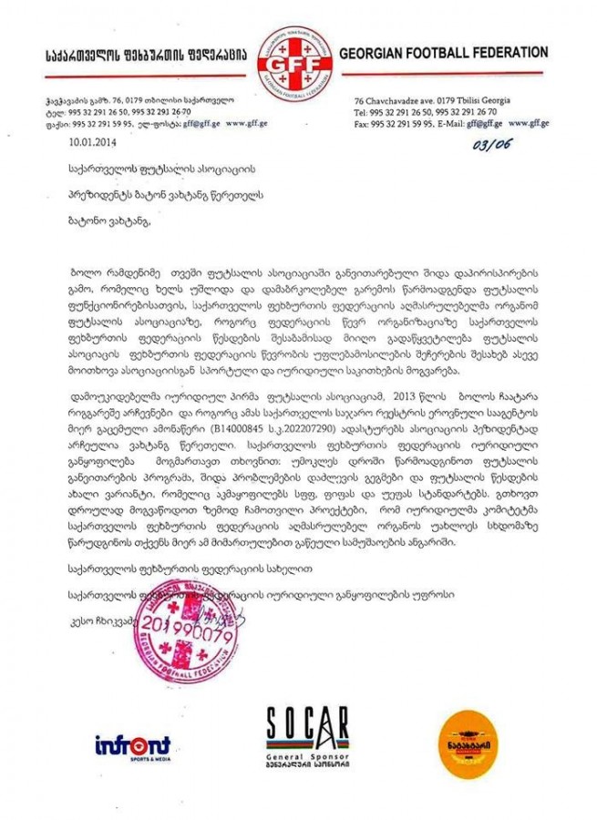 “Due to the infighting in Futsal Association, which prevented and was inhibiting the environment for the Futsal functioning, in accordance with the regulation, the Georgian Football Federation made a decision about suspending membership of the Futsal Association in the federation. Also requested arrangement of sporting and legal issues from the Association.
