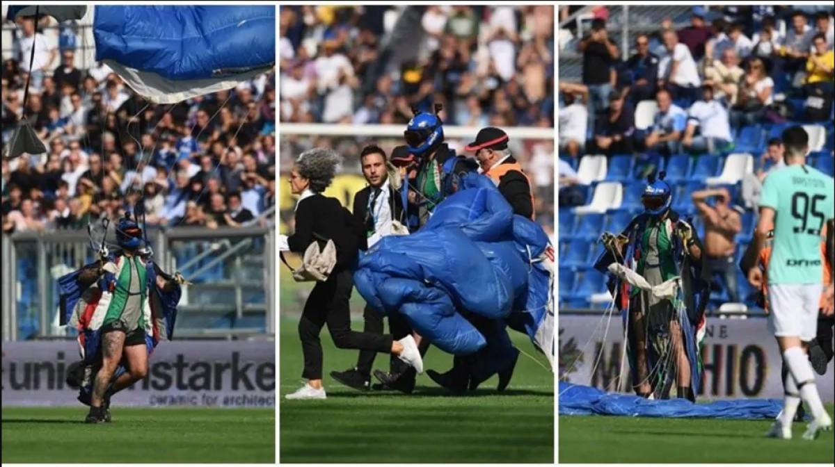 სერია A-ს მატჩის მიმდინარეობისას მოედანზე პარაშუტისტი დაეშვა (ფოტოგალერეა)