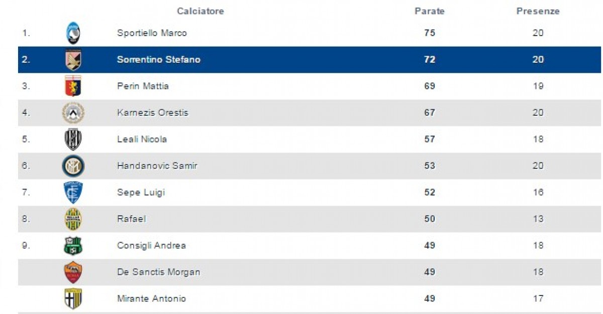 იტალიის სერია A-ს ოფიციალურმა ვებგვერდმა საინტერესო სტატისტიკა დაითვალა და განვლილი 20 ტურის შემდგომ ის მეკარეები გამოავლინა, რომლებმაც ყველაზე მეტი დარტყმა მოიგერიეს. ამ მაჩვენებლით საუკეთესო ბერგამოს “ატალანტას” 21 წლის მეკარე მარკო სპორტიელოა, რომელმაც 20 მატჩში 75 სეივი განახორციელა. მეორე პოზიციას “პალერმოს” ვეტერანი კარის დარაჯი სტეფანო სორენტინო იკავებს 72 სეივით, ხოლო სამეულის ბოლო საფეხურზე “ჯენოელი” მატია პერინია. იტალიის ნაკრების კიპერმა 69-ჯერ იხსნა საკუთარი გუნდი.