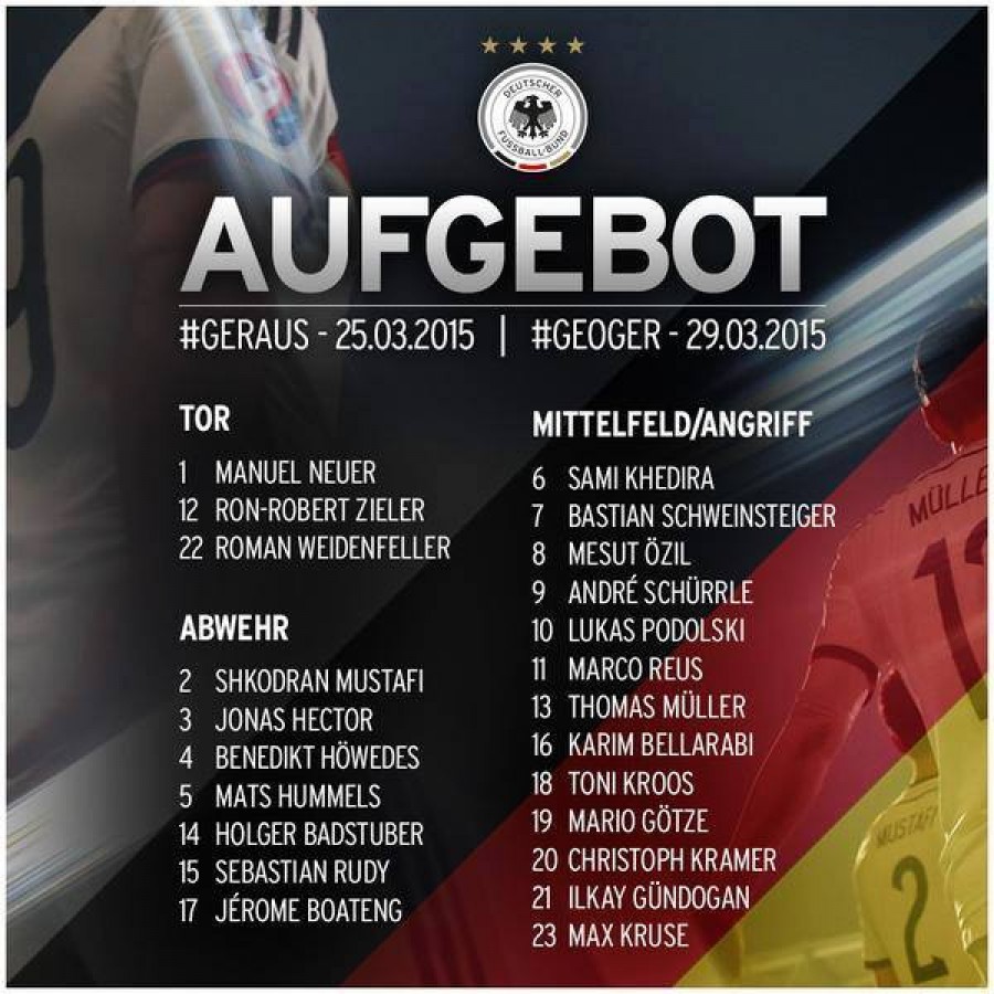 რამდენიმე წლიანი პაუზის შემდეგ გერმანიის ნაკრების რიგებში პირველად ითამაშებს ჰოლგერ ბადშტუბერი, რომელმაც არაერთი მძიმე ტრავმა გადაიტანა.