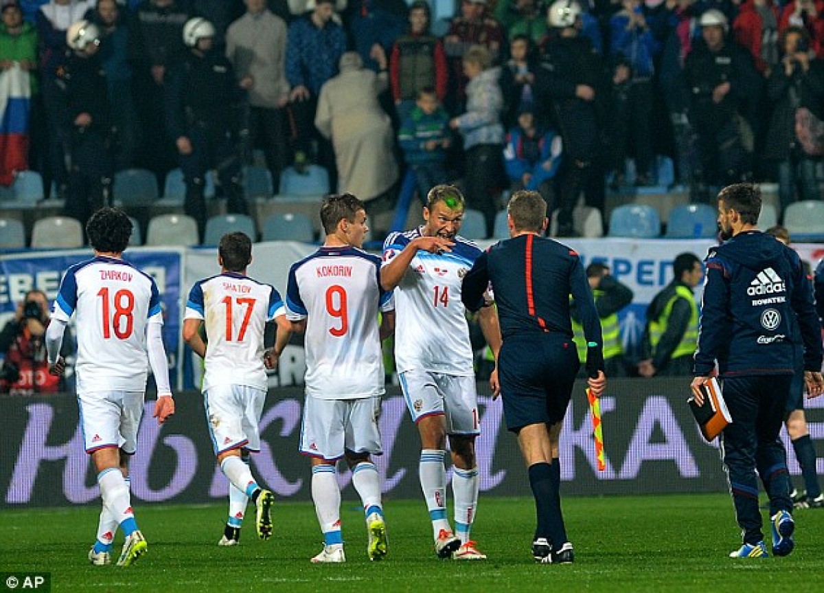 ევროპის 2016 წლის საკვალიფიკაციო ეტაპის მე-5 ტურის მატჩი ჩერნოგორიის ქალაქ პოდგორიცაში გაიმართა და რომ არა გულშემატკივრების უდისციპლინო საქციელი, თამაში იქეთკენ მიდიოდა მეტოქეები უგოლო ფრეზე გაეყრებოდნენ. მატჩი დაიწყო თუ არა რუსთა მეკარეს იგორ აკინფეევს თავში მაშხალა მოხვდა და შეხვედრა 33 წუთით შეწყდა. აკინფეევს სამედიცინო დახმარება აღმოუჩინეს და მოედნიდან საავადმყოფოში გადაიყვანეს.