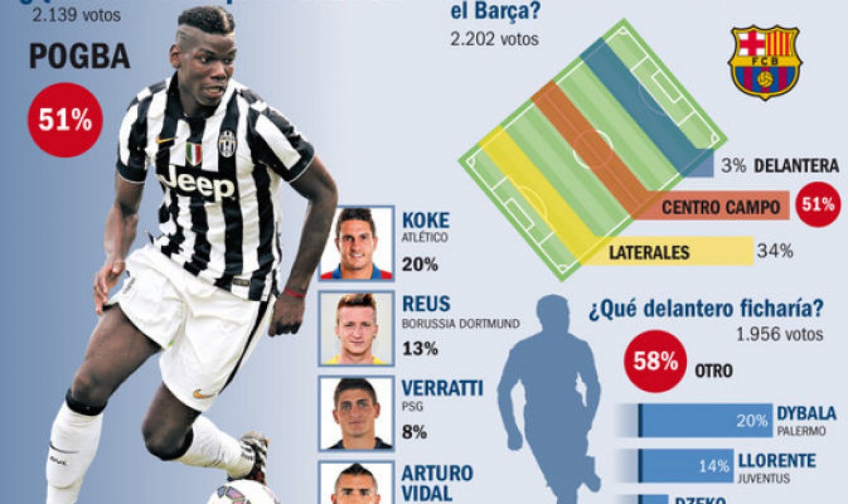 კატალონურმა გამოცემა “სპორტმა” “ბარსელონას” გულშემატკივრებს შორის გამოკითხვა ჩაატარა, თუ ვის ხილვას ისურვებდნენ ყველაზე მეტად თავიანთ საყვარელ გუნდში. აღნიშნულ გამოკითხვაში ტურინის “იუვენტუსის” ფრანგმა ნახევარმცველმა პოლ პოგბამ დიდი უპირატესობით გაიმარჯვა. “ბლაუგრანას” ქომაგების 51%-მა მხარი სწორედ პოგბას დაუჭირა.