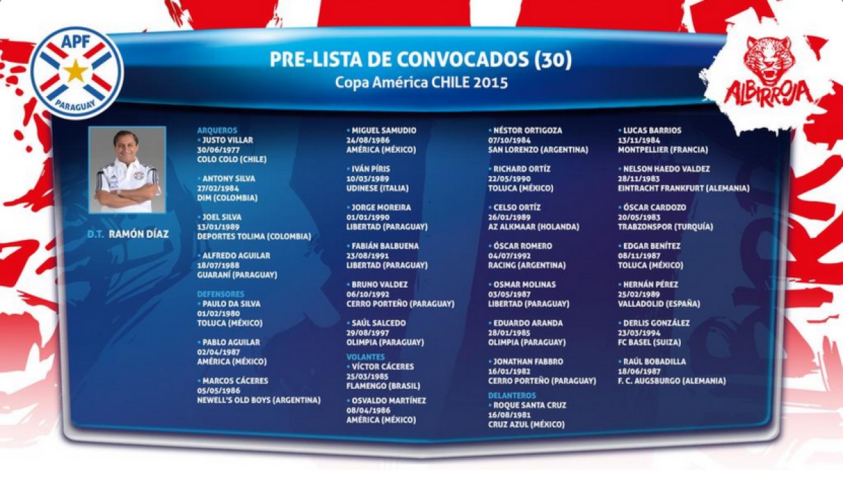 პარაგვაის ეროვნული ნაკრების მთავარმა მწვრთნელმა რამონ დიასმა 2015 წლის კოპა ამერიკისთვის გაფართოებული 30-კაციანი შემადგენლობა დაასახელა. არგენტინელი სპეციალისტი ჩილეში გასამართი ტურნირისთვის საბოლოო შემადგენლობას ივნისამდე დაასახელებს.