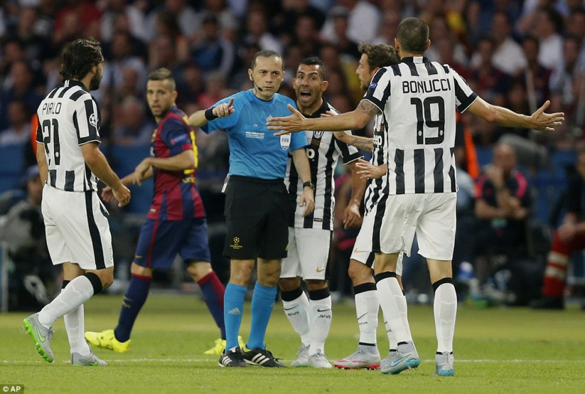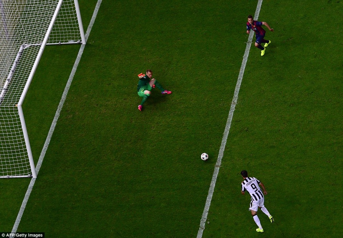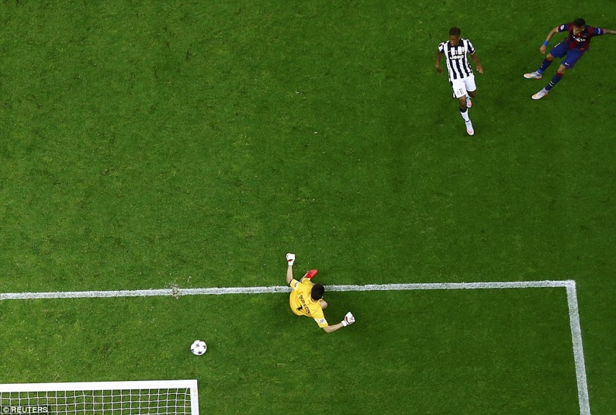 “ბარსა” უკვე მე-4 წუთზე დაწინაურდა, როცა ნეიმარმა დაფარული პასით მოძებნა ინიესტა, მან კი გვერდზე ივან რაკიტიჩს დაუგორა და ხორვატმაც ახლოდან აუღელვებლად გაიტანა – 1:0. კატალონიელებს პირველ ტაიმში საკმაო უპირატესობა ჰქონდათ და ბუფონსაც საქმე არ ელეოდა, ერთ მომენტში კი დანი ალვეშს მკვდარი ბურთი აუღო. ჩანდა ის, რომ “ბარსა” უფრო ლაღად თამაშობდა, ხოლო ალეგრის გუნდი ვერაფერს რომ ვერ უპირისპირებდა, ზოგჯერ უხეშობაზე გადადიოდა. საწყის ნახევარ საათში “ბებერი ქალბატონის’ ფეხბურთელები 13-ჯერ დაჯარიმდნენ, რაც დაგვეთანხმებით, ძალიან ბევრია.