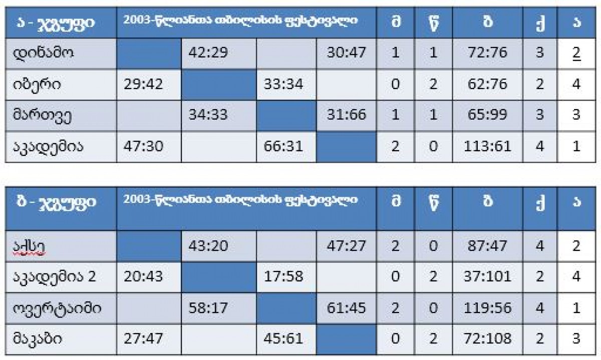 საკალათბურთო აკადემიის დარბაზში სტარტი აიღო თბილისის ფესტივალმა მინი-კალათბურთში, რომელშიც 2003 წელს დაბადებული ბავშვები მონაწილეობენ. აღნიშნული ორგანიზაციების ურთიერთთანამშრომლობით მინი-კალათბურთის ფესტივალი უკვე მეორე წელია, ტარდება. წლევანდელ გათამაშებაში 8 გუნდი მონაწილეობს, რომლებიც 2 ჯგუფში არიან განაწილებულნი. გუნდები ჯგუფებში ერთ წრედ ითამაშებენ, რის შემდეგაც დაკავებული ადგილების შედეგად მეოთხედფინალში დაწყვილდებიან.
