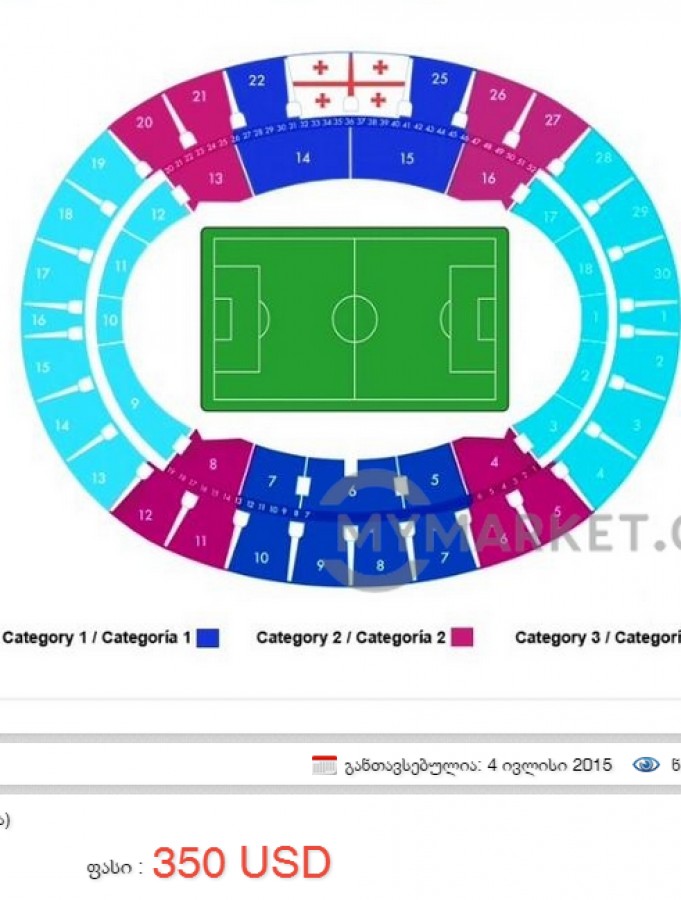 mymarket.ge-ზე განთავსებული განცხადების თანახმად, ერთი პიროვნება ორ ბილეთს ჯამში 700 დოლარად ყიდის. არაა დაკონკრეტებული თუ რომელი იარუსის ან რომელი სექტორის ბილეთი იყიდება. როგორც ფეხბურთის ფედერაციაში განგვიმარტეს, აღნიშნული ინფორმაცია მათ იციან, თუმცა არ არსებობს კანონი, რომელიც გადამყიდველს ბილეთის სასურველ ფასად გაყიდვას აუკრძალავს.