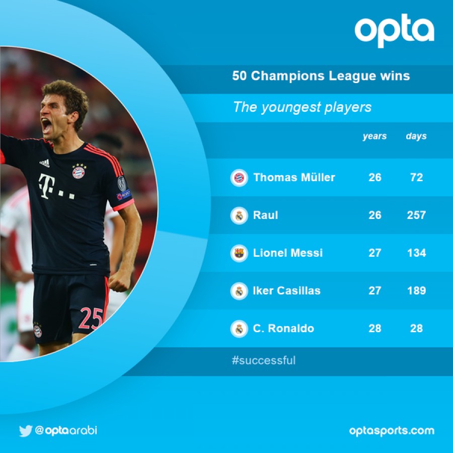 მიუნხენის “ბაიერნის” შემტევმა თომას მიულერმა ჩემპიონთა ლიგაზე 50-ე გამარჯვება 26 წლის და 72 დღის ასაკში მიითვალა და ასაკობრივი მაჩვენებლით მადრიდის “რეალის” ერთ-ერთი ლეგენდის რაულ გონსალესის (26 წელი და 257 დღე) შედეგი გააუმჯობესა.