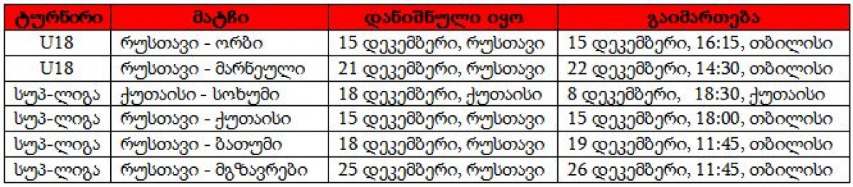 სუპერლიგის და 18-წლამდელთა ჩემპიონატის გადადებული მატჩების განრიგი