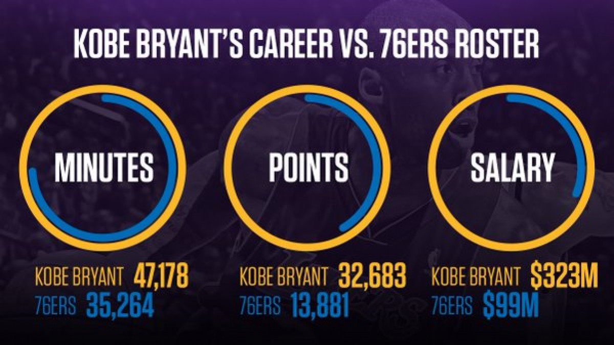 ESPN-ის ოფიციალურმა ტვიტერის გვერდმა მეტად საინტერესო სტატისტიკური მონაცემები გამოაქვეყნა. ერთმანეთს შეადარა კარიერაში კობი ბრაიანტის და “ფილადელფიის” მთელი გუნდის (16 კალათბურთელის) ჩაგდებული ქულები, ნათამაშები წუთები და გამომუშავებული თანხა, სამივე კომპონენტში ბრაიანტმა ერთად აღებული ფილადელფიის მთელი გუნდი დაჯაბნა.