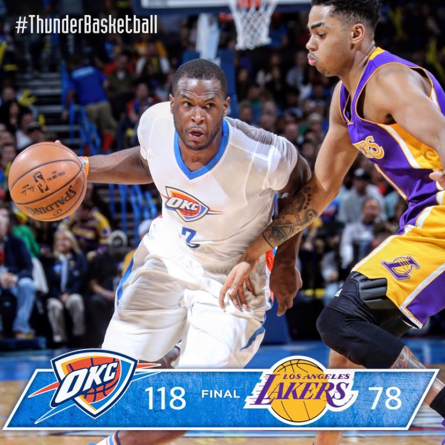 “ოკლაჰომამ” შინ “ლეიკერსი” 118:78 გაანადგურა. ლოს ანჯელესელებს გუნდის ლიდერი კობი ბრაიანტი მხრის ტრავმის გამო არ ჰყავდა. “ოკლაჰომელებმა” გუნდური კალათბურთი ითამაშეს და 7 კალათბურთელს მინიმუმ 10 ქულა ჰქონდა ჩაგდებული, მათ შორის 22 ქულით საუკეთესო კევინ დურანტი გახლდათ. “ლეიკერსმა” კლუბის ისტორიაში -40 ან უფრო დიდი ანგარიშით შეხვედრა მეექვსედ წააგო.