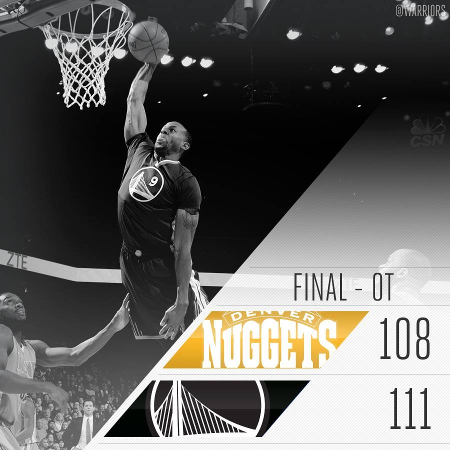“გოლდენ სტეიტმა” საკუთარ დარბაზში “დენვერს” 111:108 აჯობა. Pირველ პერიოდში ოკლენდელებმა მეტოქე 37:13 გაანადგურეს და თითქოს შეხვედრისბედი გადაწყვიტეს, თუმცა “დენვერმა” მატჩის ბოლო წამზე 2-ქულიანი ჩააგდო და ძირითადი დრო 102:102 დასრულდა. დამატებითში კი “ოქროს შტატელებმა” 9:6 იმარჯვეს. “ოქროს შტატელებს” გუნდის ლიდერ ისტეფ კარი დაუბრუნდა, თუმცა გამთამაშებელმა “დენვერთან” შეხვედრაში ტრავმა გაიმიზეზა და მალევე მოუხდა სათადარიგო სტამზე გადანაცვლება. მატჩში ყველაზე მეტი 29 ქულა გრინმა ჩააგდო, რომელმაც სამმაგი დუბლი გაიფორმა 17 მოხსნა, 14 პასი. “გოლდენ სტეიტი” 31 მოგებით და 2 მარცხით დასავლეთ კონფერენციაში პირველ ადგილს იკავებს.