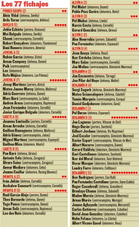 ძირითად გუნდში ორი ფეხბურთელი არდა თურანი და ალეიშ ვიდალი ითამაშებენ, სარეზერვო გუნდის ღირსებას ხოკინ ესკიეტა, მოი დელგადო, ჩემი, რობერტ გონსალვეში და დანი რომერა დაიცავენ, ხოლო დანარჩენი ფეხბურთელები ახალგაზრდულ გუნდებში გადანაწილდებიან.