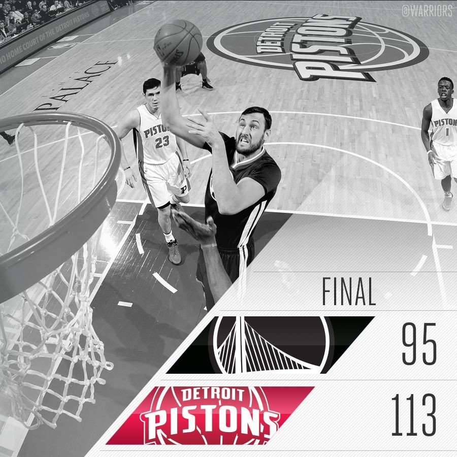 “გოლდენ სტეიტმა” სეზონში მეოთხე მარცხი განიცადა, ოკლენდელები დეტროიტში “პისტონთან” 113:95 დამარცხდნენ. მატჩში გადამწყვეტი მეორე პერიოდი აღმოჩნდა, რომელიც “დეტროიტმა” 38:19 მოიგო. მატჩში ყველაზე მეტი 38 ქულა სტეფ კარიმ ჩააგდო. გამთამაშებელმა 15-დან 7 სამქულიანი, 11-დან 6 ორქულიანი და 6-დან 5 საჯარიმო სროლა გამოიყენა. “დეტროიტმა” გუნდური კალათბურთი ითამაშა, ექვსმა კალათბურთელმა მინიმუმ 10 და მეტი ქულა ჩააგდო მათ შორის 14 ქულით და 21 მოხსენით ანდრე დრამონდი საუკეთესო გახლდათ. “გოლდენ სტეიტი” 37 მოგებით 4 წაგებით დასავლეთ კონფერენციაში პირველ ადგილზე იმყოფება.