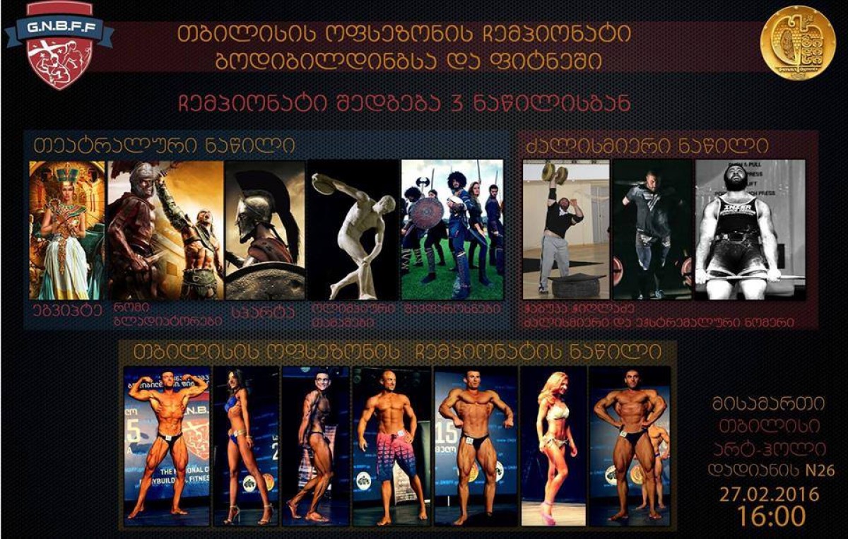 27 თებერვალს საქართველოს ფიტნესისა და ბოდიბილდინგის ფედერაცია „არტ-ჰოლში“ თბილისის „OFF-სეზონის“ ჩემპიონატს ატარებს, რომელიც კონკურსში მონაწილე სპორტსმენების შესრულებით, თეატრალური ნომრებით იქნება გამდიდრებული.
