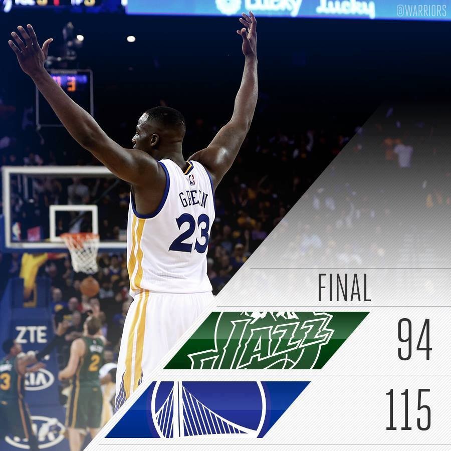 “გოლდენ სტეიტმა” შინ “იუტა ჯაზი” 115:94 დაამარცხა. “მეომრებმა” მიმდინარე სეზონში 57-ე გამარჯვება იზეიმეს. “ოქროს შტატელებმა” მეტოქეს ოთხივე პერიოდში აჯობეს. მატჩში ყველაზე მეტი 23 ქულა კლეი ტომპსონმა ჩააგდო, სტეფ კარიმ ორმაგი დუბლი შეასრულა, 12 ქულა, 10 მოხსნა, თუმცა კარისგან მაინც დაბალშედეგიანობად შეგვიძლია ჩავთვალოთ. “იუტაში” ყველაზე მეტი 18 ქულა ბარკმა ჩააგდო.