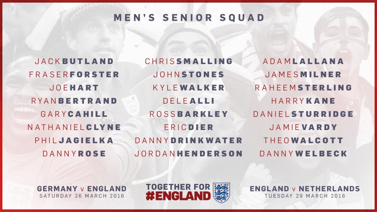 ჰოჯსონის რჩეულთა სიაში პირველად მოხვდნენ "ლესტერის" ნახევარმცველი დანი დრინქუოთერი და "ტოტენჰემის" მცველი დანი როუზი. დანიელ სტარიჯი, დანი უელბეკი, ჯორდან ჰენდერსონი და ფრასერ ფორსტერი ნაკრებს ტრავმის შემდეგ დაუბრუნდნენ, უეინ რუნი კი სპარინგ-მატჩებს გამოტოვებს.