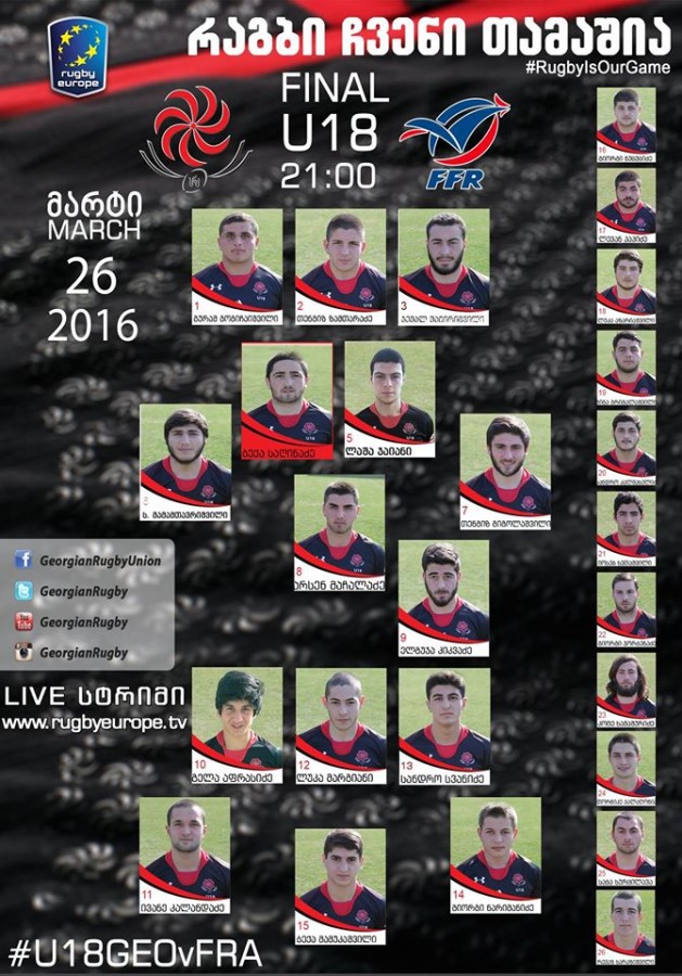 საქართველოს 18-წლამდე მორაგბეთა ნაკრები ხვალ ლისაბონში, თბილისის დროით 21 საათზე საფრანგეთის წინააღმდეგ ასაკობრივი ევროპის ჩემპიონატის ფინალურ შეხვედრას გამართავს.