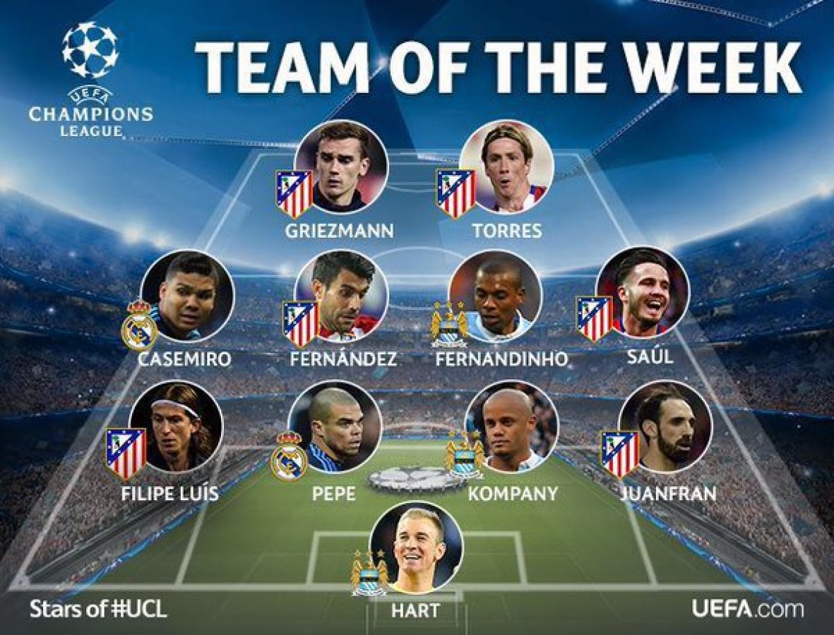 უეფას ოფიციალურმა ვებგვერდმა ჩემპიონთა ლიგის პირველი ნახევარფინალური მატჩების შემდეგ უკვე ტრადიციადქცეული კვირის სიმბოლური ნაკრები გამოაქვეყნა. ჩემპიონთა ლიგის კვირის გუნდში 6 ფეხბურთელი მოხვდა მადრიდის “ატლეტიკოდან”, რომელმაც საკუთარ მოედანზე “ბაიერნი” დაამარცხა (1:0). ნახევარფინალის მონაწილეთაგან მხოლოდ გერმანული კლუბი დარჩა სიმბოლურში წარმომადგენლის გარეშე.