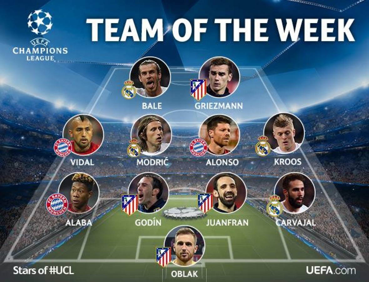 საუკეთესო გუნდის კარს იან ობლაკი იცავს. "ატლეტიკოს" სლოვენიელმა მეკარემ რამდენჯერმე იხსნა საკუთარი გუნდი და მას ჯამში 10 სეივი დაუგროვდა. მეკარესთან ერთად სიმბოლურში მოხვდნენ დიეგო გოდინი და ხუანფრანი, "ბაიერნის" შეტევების გამკლავება უმეტესად მათ უწევდათ. "რეკორდმაისტერთან" "როხიბლანკოსი" 1:2 დამარცხდა, თუმცა სტუმრად გატანილი გოლის წყალობით შემდეგ ეტაზე გავიდა. ერთადერთი გოლი "ალიანს არენაზე" საფრანგეთის ეროვნული ნაკრების თავდამსხმელმა ანტუან გრიზმანმა გაიტანა და მატჩის გმირი გახდა. რა თქმა უნდა, ფორვარდი უეფამაც გამოარჩია.