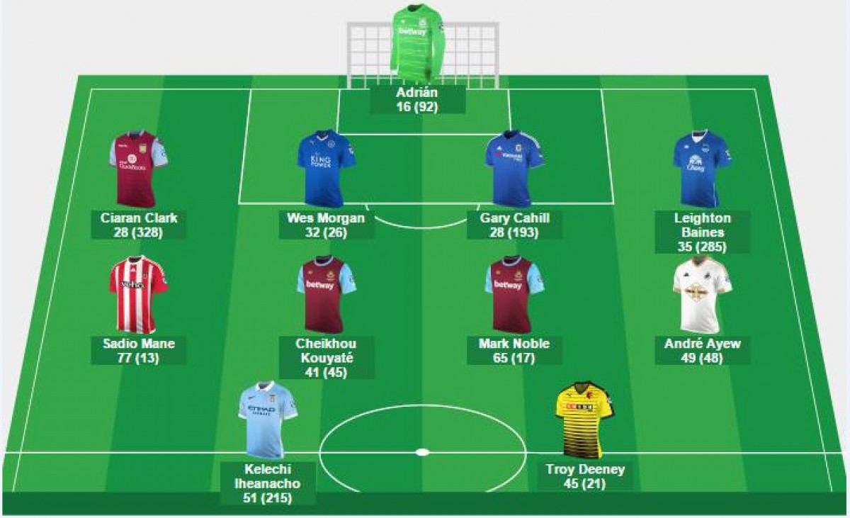 ყველაზე მეტი წარმომადგენელი "ვესტ ჰემს" ჰყავს. "ჩაქუჩების" მხრიდან მეკარე ადრიანი გამოარჩიეს. ესპანელმა "ვესტ ბრომვიჩთან" მოგებულ (3:0) მატჩში რამდენიმე ეპიზოდში იხსნა საკუთარი გუნდი. გოლის ავტორები შეიხუ კუიატე და მარკ ნობლი (დუბლი) ასევე საუკეთესო გუნდში მოხვდნენ.