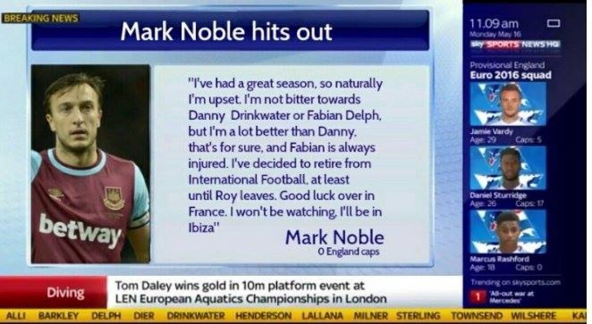“ვესტ ჰემის” ნახევარმცველი მარკ ნობლი, ინგლისის ნაკრების მთავარი მწვრთნელის, როი ჰოჯსონის გადაწყვეტილებას გამოეხმაურა, რომლის მიხედვითაც, “ჩაქუჩების” მოთამაშე ევრო 2016-ის გაფართოებულ შემადგენლობაში ვერ მოხვდა.