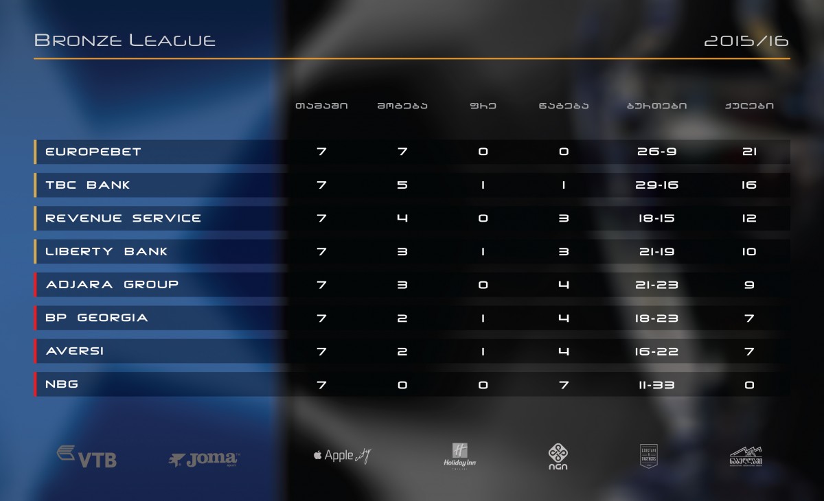 დასრულდა ბრინჯაოს ლიგის წლევანდელი გათამაშება. კვირას მეშვიდე ტურის სამი დარჩენილი დაპირისპირება გაიმართა. ავერსმა ეროვნული ბანკის გუნდს სძლია 5-1, ტურის ცენტრალური შეხვედრა - „საბანკო დერბი“ ლიბერთის და თიბისის გუნდების მონაწილეობით ფრედ 1-1 დასრულდა, ხოლო შემოსავლების სამსახურმა აჭარა ჯგუფს სძლია 4-2. ამრიგად გაირკვა იმ ოთხი გუნდის ვინაობა, რომლებმაც მომდევნო წელს რანგით მაღალ, ვერცხლის ლიგაში თამაშის უფლება მოიპოვეს: შვიდიდან შვიდი მოგებით გათამაშების გამარჯვებული ევროპაბეთი გახდა, მეორე ადგილზე დაასრულა ასპარეზობა თიბისი ბანკმა, კიდევ ორი საგზური შემოსავლების სამსახურის და ლიბერთი ბანკის გუნდებმა მოიპოვეს.