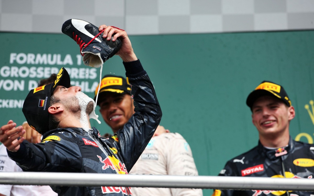 ასე იყო თუ ისე, „რედ ბულის“ პილოტებმა ერთად კვარცხლბეკზე ასვლა ამ სეზონში პირველად შეძლეს. რიკარდიმ მისთვის საიუბილეო, მეასე რბოლა მეორე ადგილით დააგვირგვინა, რაც კვარცხლბეკზე, საკუთარი ფეხსაცმლით დალეული შამპანურით აღნიშნა. ამგვარად, ზედიზედ მეორე რბოლაა, ის კვარცხლბეკზე ასვლას ახერხებს. ამასთან, თუ უნგრეთში მესამე იყო, გერმანიაში ერთი საფეხურით მაღლა ავიდა...
