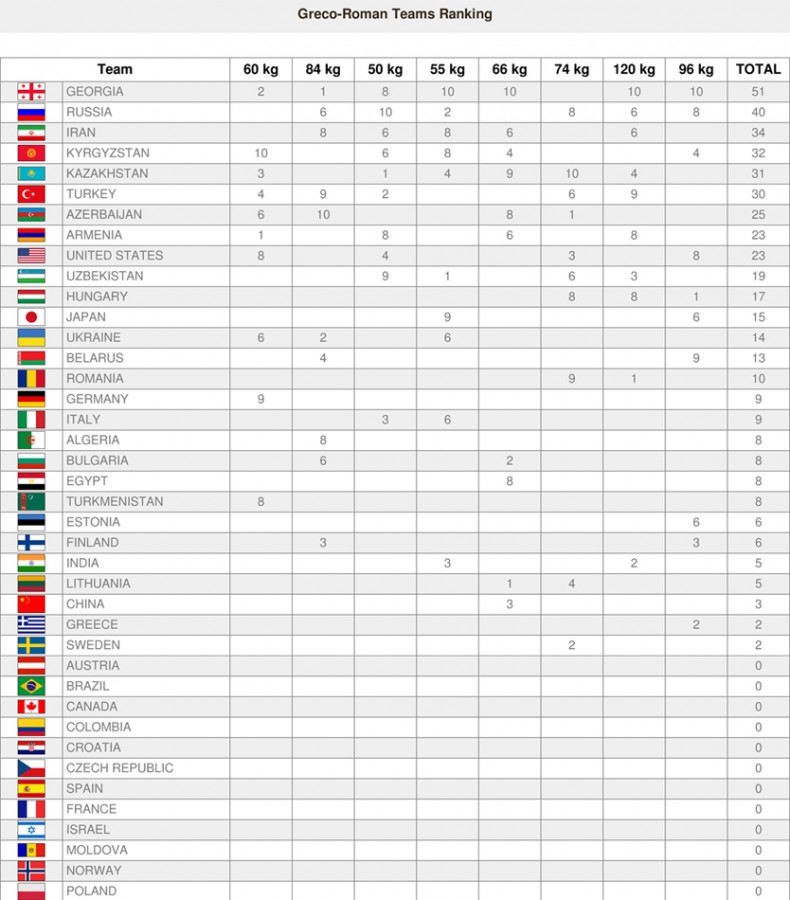 ამგვარად, სილაგაძის გუნდმა შარშანდელი ბრწყინვალე შედეგი გაიმეორა და გუნდური ჩემპიონობა არავის დაუთმო. ჩვენმა ნაკრებმა საერთო ჩათვლაში 51 ქულით პირველი ადგილი დაიკავა და უკან რუსეთის (40) და ირანის (34) ნაკრებები მოიტოვა.