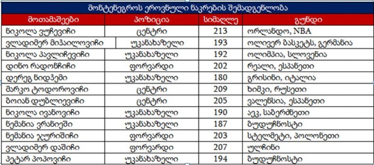მონტენეგროელები საქართველოს მსგავსად წაუგებლები არიან – ტანიევიჩის გუნდმა სლოვაკებს შინ, ალბანელებს კი სტუმრად მოუგო. საქართველომ კი პირიქით – სლოვაკეთში მასპინძლებს და თბილისში ალბანელებს იოლად სძლია. სლოვაკეთში 94:63 მოგებულ მატჩში დისკვალიფიკაცია მიიღეს ვიქტორ სანიკიძემ და ბესო ლეჟავამ. ორივე ეს კალათბურთელი მონტენეგროსთან მატჩში ითამაშებს.