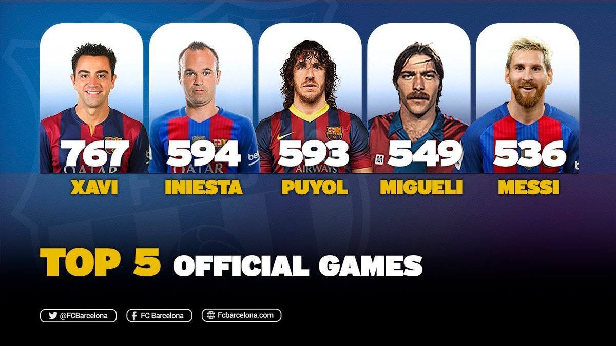 ლიონელს ჩატარებული შეხვედრების რეიტინგში მიგელი (549), კარლეს პუიოლი (593), ანდრეს ინიესტა (594) და ჩავი ერნანდესი (767) უსწრებენ.
