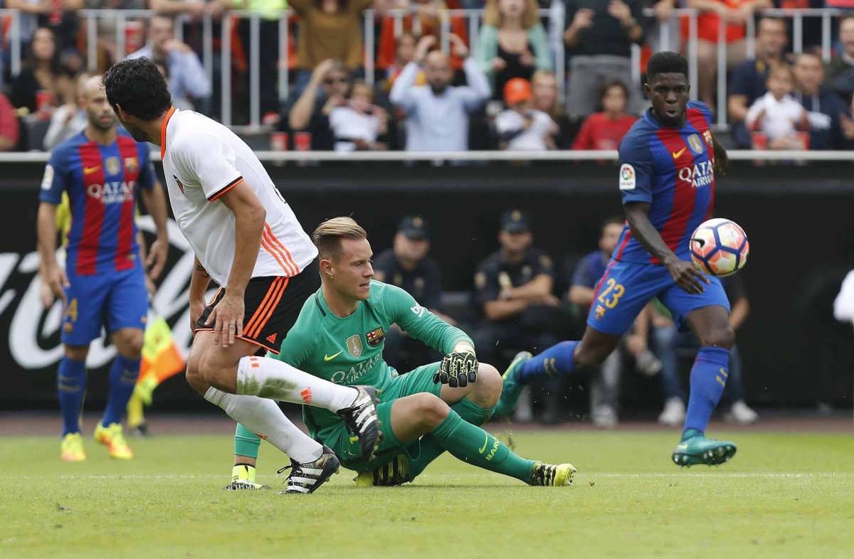 ტაიმის მიწურულს კი, “ვალენსიამაც” შექმნა სახიფათო მომენტი. მარჯვენა ფლანგზე კვლავ ჟოაო კანსელო აქტიურობდა, რომელმაც ლუკას დინიეს ბევრი პრობლემა შეუქმნა. მისი აქტიურობის შემდეგ, 44-ე წუთზე დანიელ პარეხოს გათანაბრება შეეძლო, მაგრამ ახლო მანძილიდან ტერ შტეგენს ვერ აჯობა.