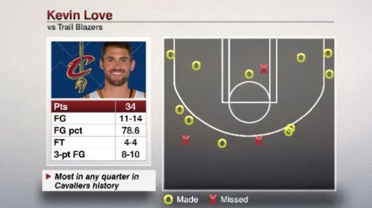 “კლივლენდ კავალიერსის” ერთ-ერთმა ლიდერმა კევინ ლავმა “პორტლენდთან” (137:125) მოგებული შეხვედრის პირველ პერიოდში 34 ქულა ჩააგდო. კევინმა 10-დან 8 სამქულიანი, 4-დან სამი ორქულიანი და 4-დან ოთხი საჯარიმო სროლა ჩააგდო. ერთ პერიოდში ყველაზე მეტი ქულა კლეი ტომპსონის ანგარიშზეა, რომელმაც შარშანდელ სეზონში პირველ პერიოდში 37 ქულა მოათავსა კალათში.