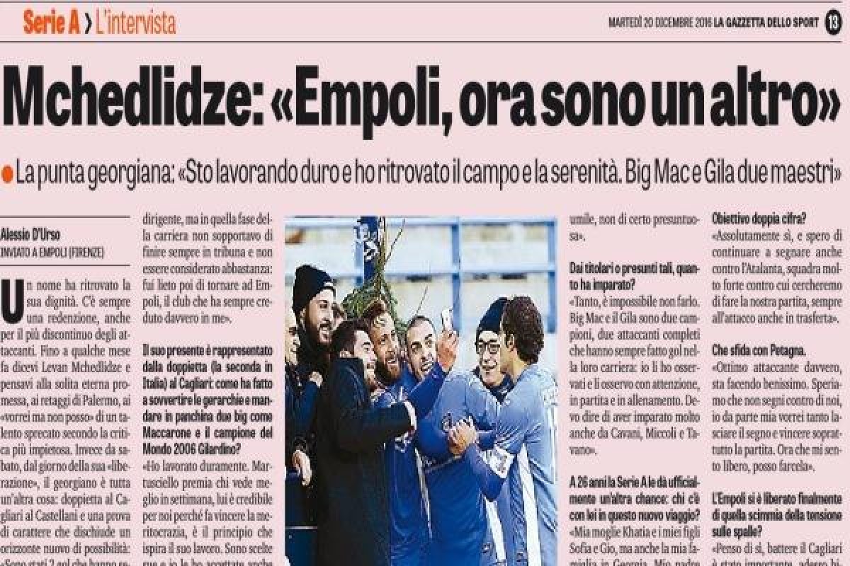 “ემპოლის” ქართველი ფორვარდი ლევან მჭედლიძე სერია A-ს უკანასკნელ ტურში დუბლით გამოირჩა. ლევანი იტალიური მედიის უყურადღებობას არასდროს უჩიოდა, მაგრამ ახლა ინტერესმა უფრო იმატა. ავტორიტეტულმა გამოცემა “გაძეტა დელო სპორტმა” 26 წლის ქართველთან საკმაოდ საინტერესო ინტერვიუ ჩაწერა, რომელშიც ამჟამინდელ მდგომარეობაზეცაა საუბარი და წარსულზეც.