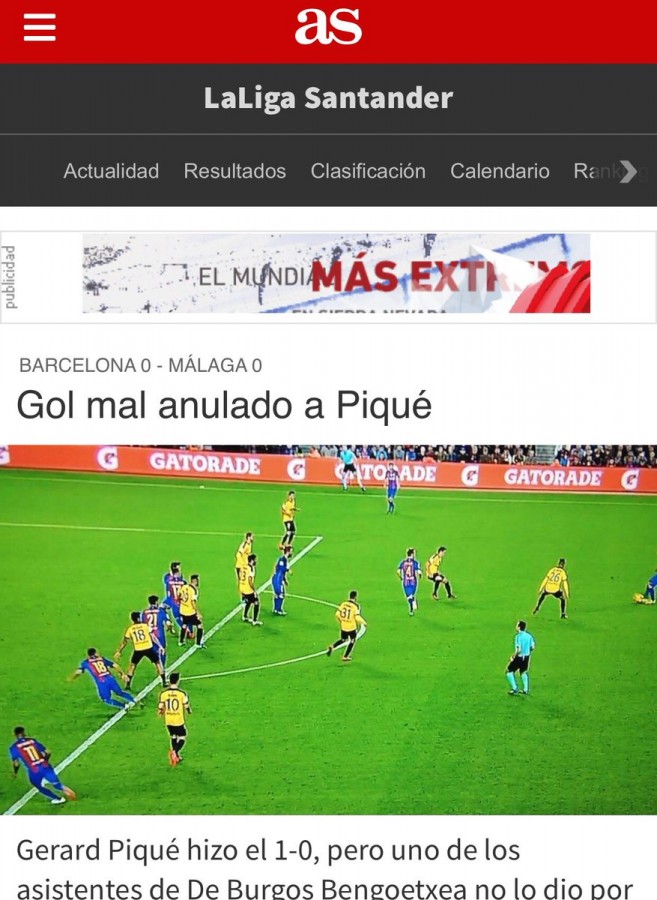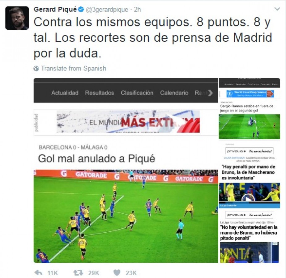 კატალონიის “ბარსელონას” მცველი ჟერარ პიკე ესპანელი მსაჯების წინააღმდეგ საჯაროდ კიდევ ერთხელ გამოვიდა. პიკემ საკუთარი ტვიტერის გვერდზე ავტორიტეტული ესპანური გამოცემების, AS-ისა და MARCA-ს ფოტოები გამოაქვეყნა, რომლებიც არბიტრების საეჭვო გადაწყვეტილებებს ასახავენ.