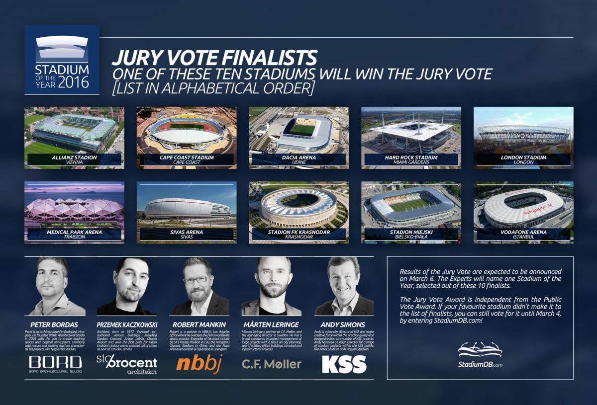 ჟიურიმ, რომელიც 5 არქიტექტორისგან შედგება, 2016 წელს აშენებული საუკეთესო სტადიონების სია დაასახელა. 4 მარტამდე ნებისმიერ დარეგისტრირებულ პირს შეუძლია ხმის მიცემა ამ საიტზე - www.stadiumDB.com.