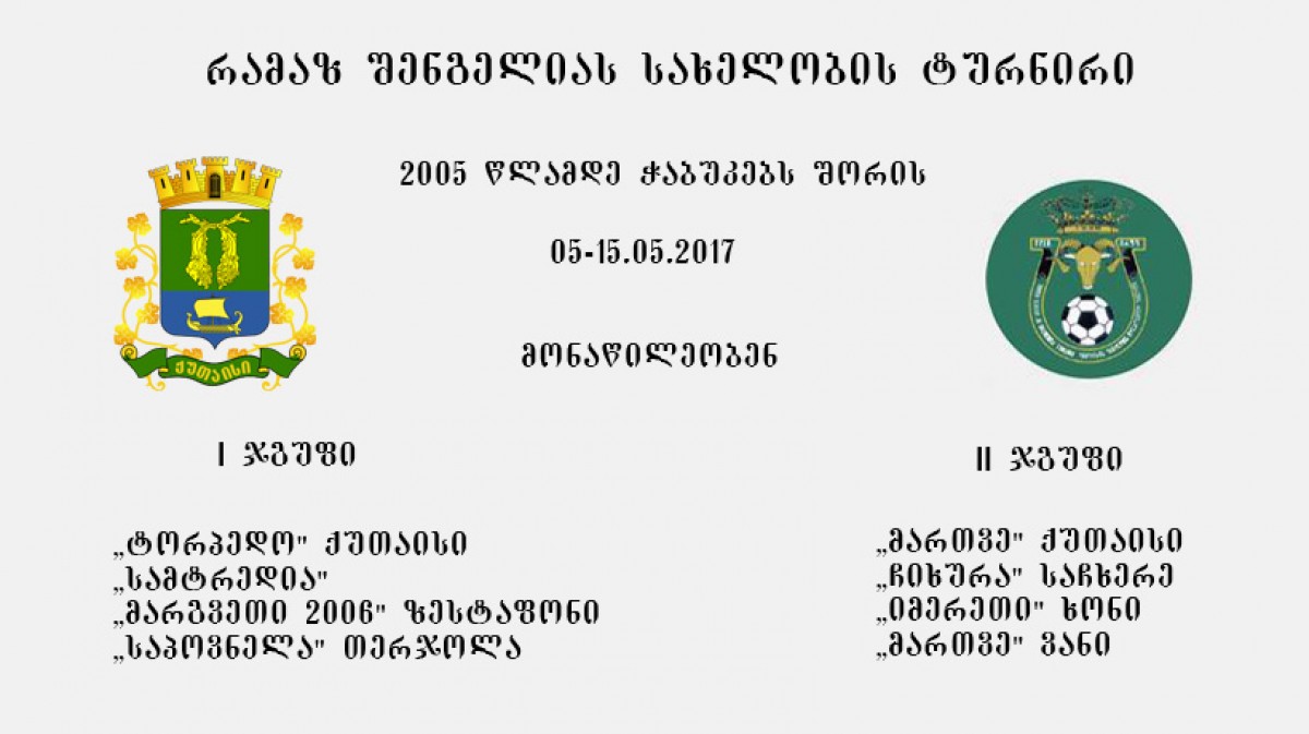 ხვალიდან ქუთაისი ფეხბურთში 13 მაისის ისტორიული გამარჯვებისადმი მიძღვნილ რამაზ შენგელიას სახელობის ტურნირს უმასპინძლებს. გათამაშებას, რომელშიც იმერეთის რეგიონის 2005 წლამდე დაბადებულ ჭაბუკთა 8 გუნდი მონაწილეობს, ორგანიზებას ქ. ქუთაისის მერიის კულტურის, სპორტის, განათლების, ძეგლთა დაცვისა და ახალგაზრდობის საქმეთა სამსახური და იმერეთის რეგიონული ფეხბურთის ფედერაცია უწევენ.
