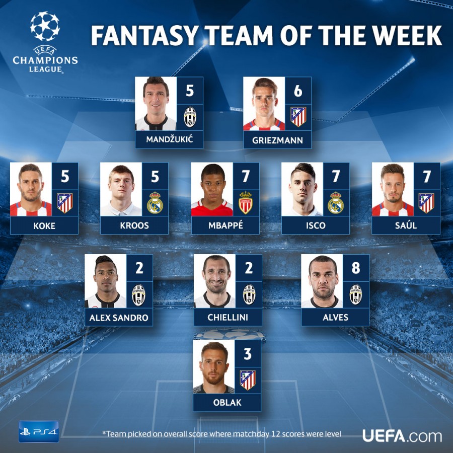 უეფას ოფიციალურმა ვებგვერდმა ნახევარფინალური ეტაპის განმეორებითი მატჩების შემდეგ კვირის სიმბოლური ნაკრები დაასახელა. ტურინის "იუვენტუსმა" მეორე შეხვედრაშიც აჯობა "მონაკოს" და იტალიური გუნდიდან საუკეთესო 11 ფეხბურთელს შორის 4 მოხვდა, დაცვის ხაზი კი საერთოდ "იუვეს" მოთამაშეებითაა დაკომპლექტებული. ფრანგული გუნდიდან მხოლოდ კილიან მბაპე გამოარჩიეს.