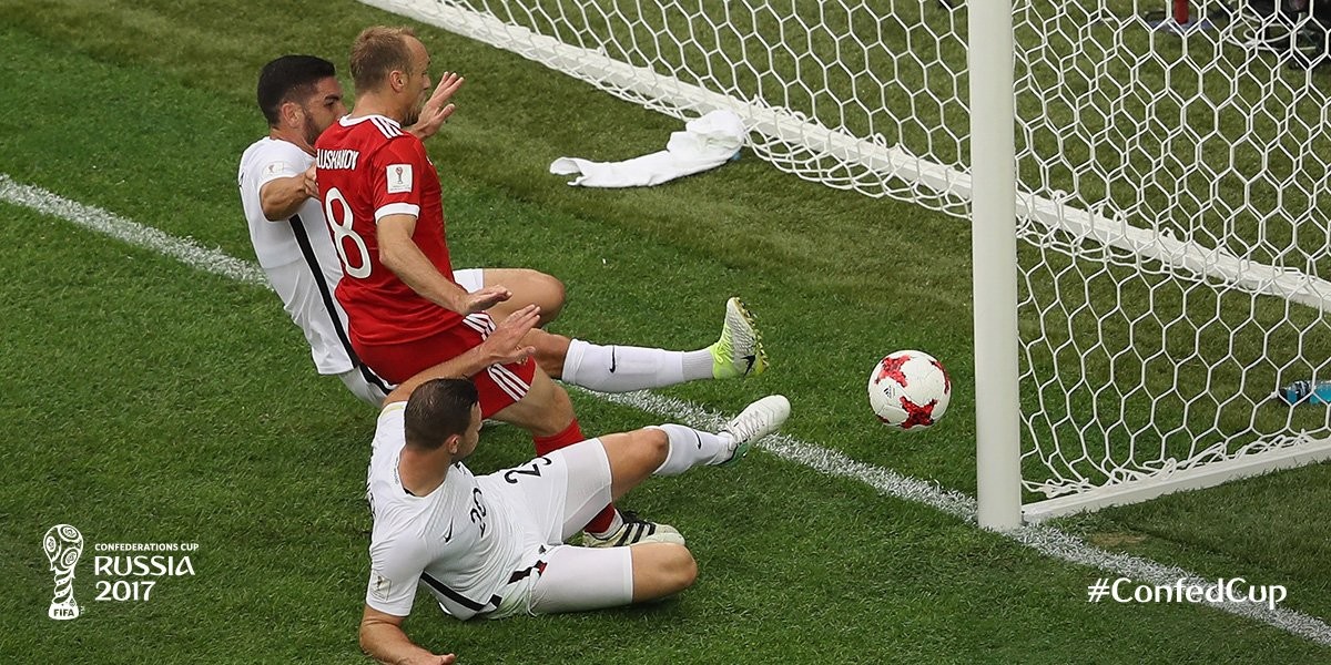 რუსეთის ნაკრებმა თავიდანვე შეუტია და ახალ ზელანდიას ორჯერ მოუწია ცარიელი კარიდან ბურთის გამოტანა. საბოლოოდ, ყველაფერი იქით მიდიოდა, რომ მასპინძლები გოლს გაიტანდნენ და გაიტანეს კიდეც: სტუმრებმა საკუთარ ნახევარზე დაუდევრად ითამაშეს და პოლოზის დიდებული პასით დენის გლუშაკოვი მეკარესთან პირისპირ დარჩა - „სპარტაკის“ კაპიტანმა შანსი ვერ გამოიყენა და ბურთი ძელს მოხვდა, თუმცა ბოქსალმა თავის კარში ჩაჭრა ძელიდან ასხლეტილი ბურთი და კონფედერაციათა თასზე პირველი გოლიც ასე გავიდა.