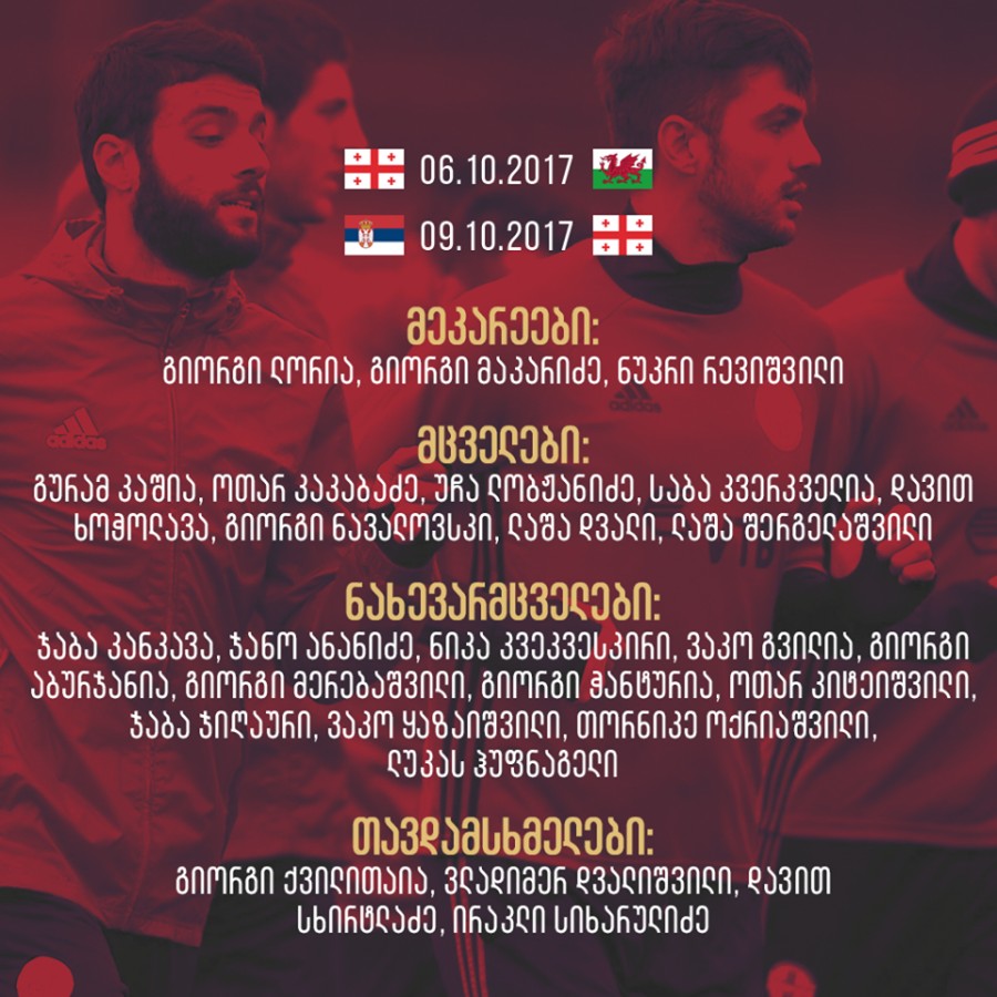 საქართველოს ნაკრების მთავარმა მწვრთნელმა ვლადიმირ ვაისმა მსოფლიოს 2018 წლის ჩემპიონატის შესარჩევი ეტაპის დასკვნითი ორი მატჩისთვის ეროვნულ გუნდში 27 ფეხბურთელს უხმო. საქართველოს ფეხბურთის ფედერაციის პრესსამსახურის ცნობით, ნაკრები უელსთან და სერბეთთან შეხვედრებისთვის მზადებას 2 ოქტომბერს დაიწყებს. ეროვნულ გუნდში გამოძახებულნი არიან: