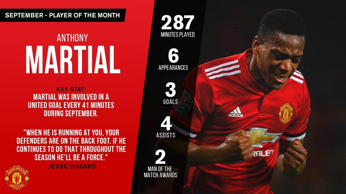საფრანგეთის ეროვნული ნაკრების შემტევი ანტონი მარსიალი "მანჩესტერ იუნაიტედის" გულშემატკივრებმა სექტემბრის თვის საუკეთესო ფეხბურთელად დაასახელეს. აღნიშნული ინფორმაცია კლუბის ოფიციალურმა ვებგვერდმა გაავრცელა.