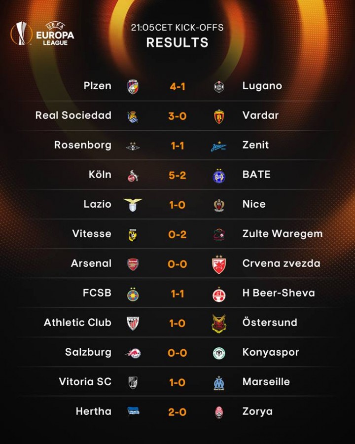 ერთადერთი გუნდი, რომელსაც 100%-იანი შედეგი აქვს რომის “ლაციოა”, რომელმაც საკუთარ მოედანზე “ნიცა” დაამარცხა. გამარჯვების გოლი 92-ე წუთზე გავიდა: ლე მარჩანდმა ავტოგოლი გაიტანა და “არწივებმა” ისე მოიგეს, რომ მეტოქის კარში ზუსტად არ დაურტყამთ. ჯგუფის მეორე მატჩში “ვიტესმა” “ვარეგემს” უმასპინძლა და ორი უპასუხო ბურთი გაუშვა. გურამ კაშიამ 67-ე წუთამდე ითამაშა.