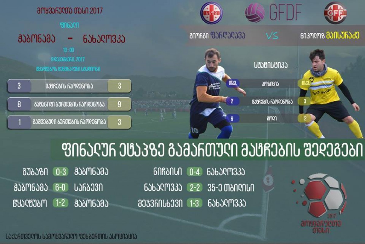 შაბათს, 9 დეკემბერს, 13:00 საათზე, წყალტუბოს ცენტრალურ სტადიონზე, „მოყვარულთა თასი 2017-ის“ გათამაშების ფინალი გაიმართება, სადაც ერთმანეთს დასავლეთ და აღმოსავლეთ საქართველოს გამარჯვებული გუნდები: ფოთის „ჭაბონამა“ და თბილისის „ნახალოვკა“ დაუპირისპირდებიან.