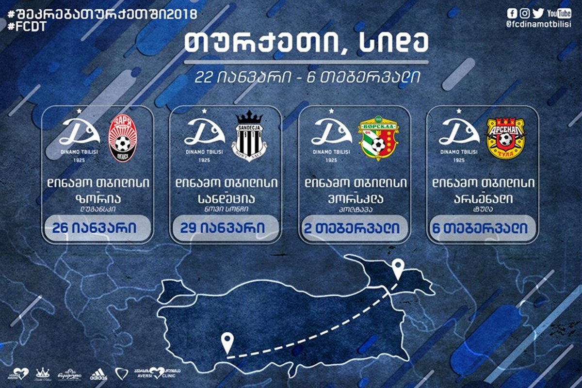26 იანვარს “დინამოს” მეტოქე ლუგანსკის “ზორია” იქნება, 29 იანვარს კახი კაჭარავას გაწვრთნილები ნოვი სონჩის “სანდეციას” დაუპირისპირდებიან, 2 თებერვალს პოლტავის “ვორსკლას”, 6 თებერვალს კი ტულის “არსენალს”.