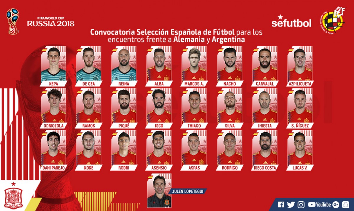 ესპანეთის ფეხბურთის ფედერაციის ოფიციალური ვებგვერდის ინფორმაციით, ლოპეტეგის რჩეულთა სია შემდეგნაირად გამოიყურება:
